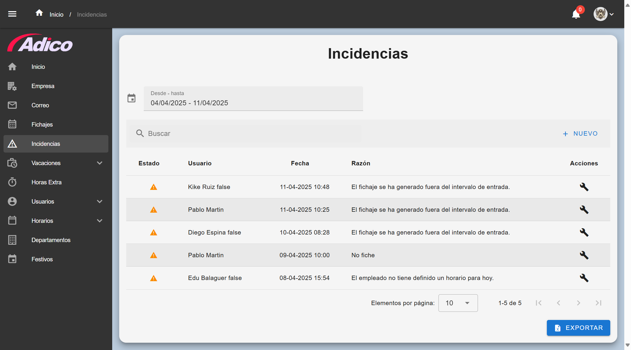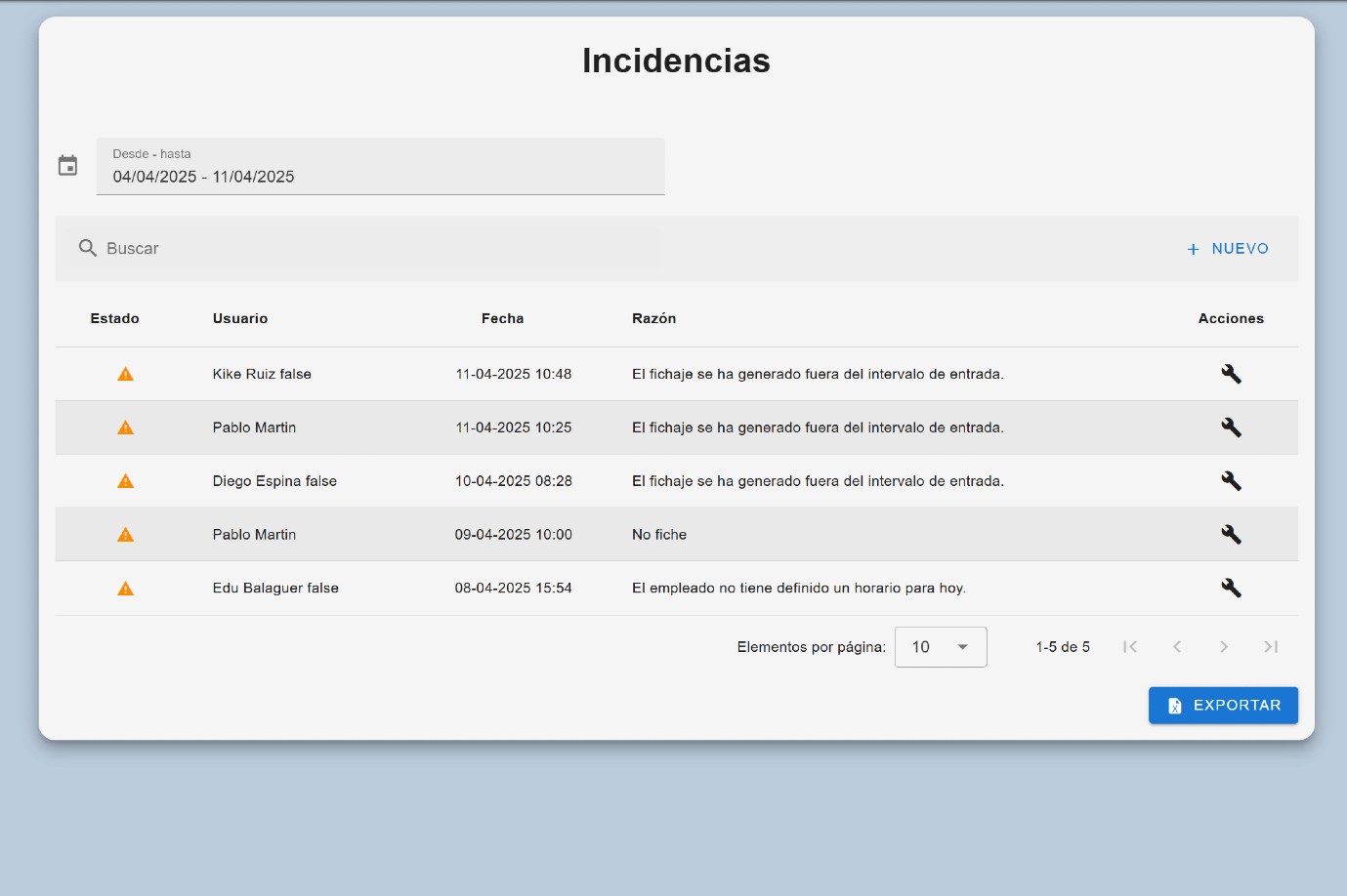 Registra y gestiona incidencias laborales de forma eficiente, permitiendo un seguimiento detallado y la resolución rápida de cualquier problema que surja. Resuelve problemas rápidamente y minimiza interrupciones en el trabajo.